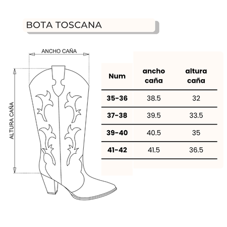 Es una bota de calce directo, es decir no posee cierre, y en su caña presenta detalles característicos del estilo texano que las hacen ideales para un look moderno y atemporal. La suela es de cuero, taco ancho para asegurarte una pisada cómoda durante todo el día. Altura del taco 6 cm.
